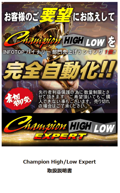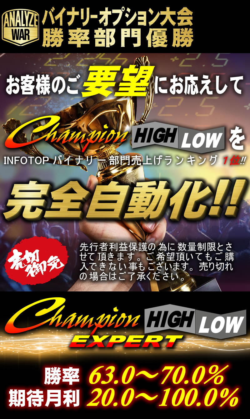 皆様のお力添えで、こうして、自動化したChampion High/Low の自動化版『Champion High/Low Expert』を世に出す事ができました事を、この場でお礼を申し上げます。ありがとうございました。