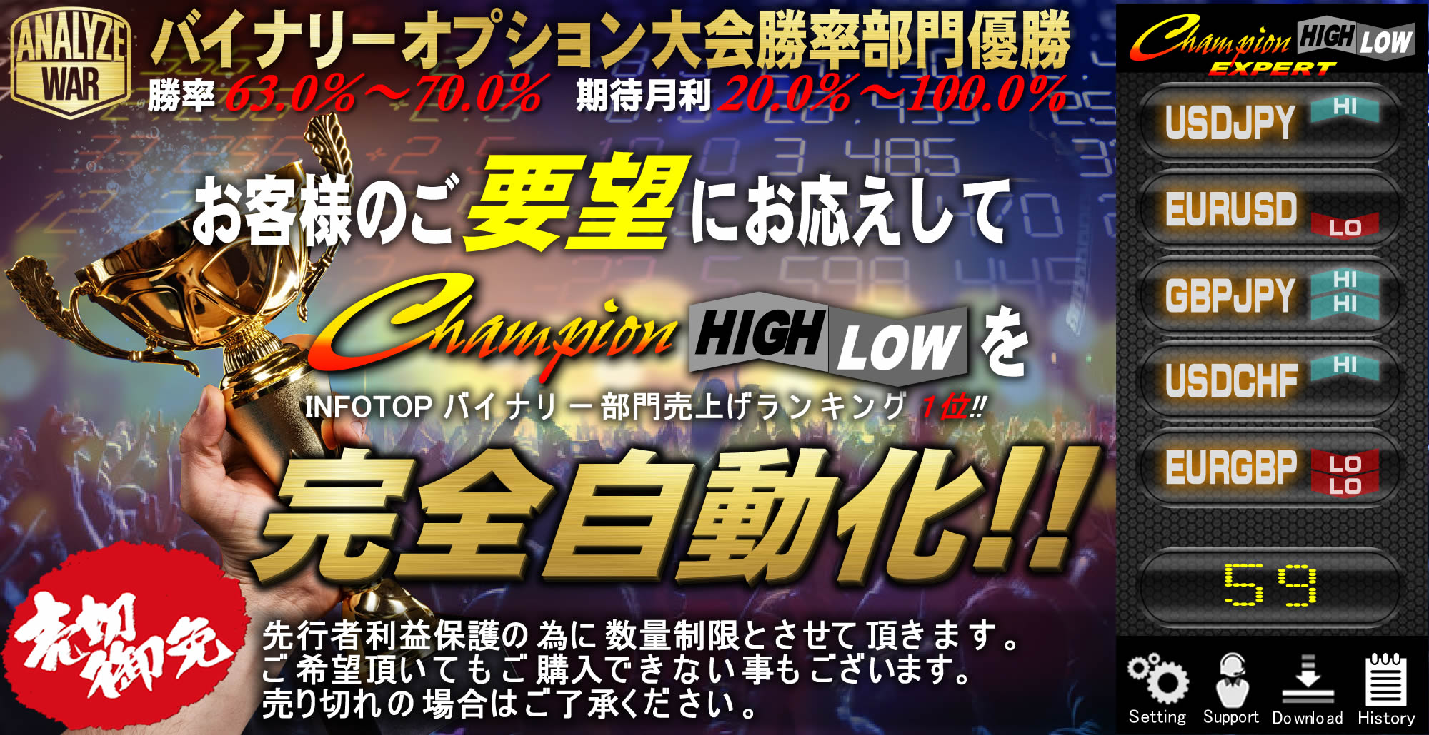 多くの方にChampion High/Low をご利用頂いて利益を上げて欲しいと思っていながら、そういった方の声にお応えできない事を、とても悔しくも感じておりました。